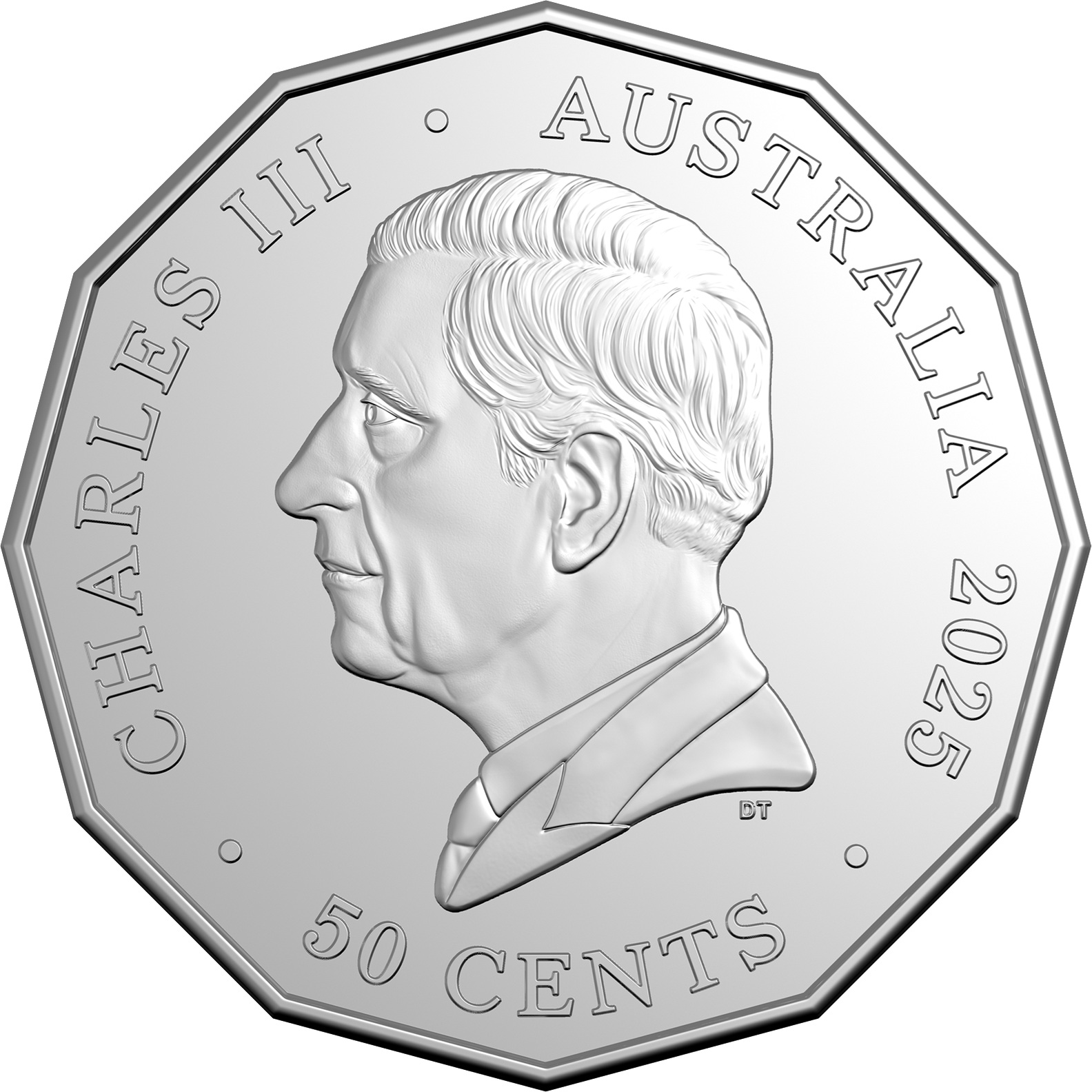 A l’avers, gravé par l’artiste Dan Thorne, dont la signature DT apparaît sous l’épaule gauche, le portrait de Sa Majesté le roi Charles III à gauche, portant un costume, une chemise et une cravate ; en légende, le nom du souverain « CHARLES III », la valeur faciale « 50 CENTS », le nom du pays émetteur « AUSTRALIA » (en français AUSTRALIE) et le millésime « 2025 ».