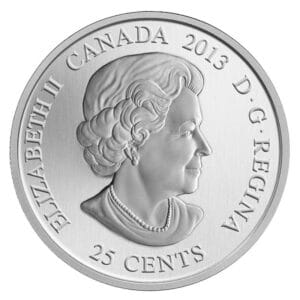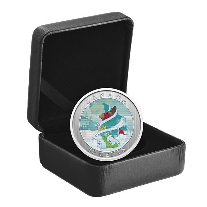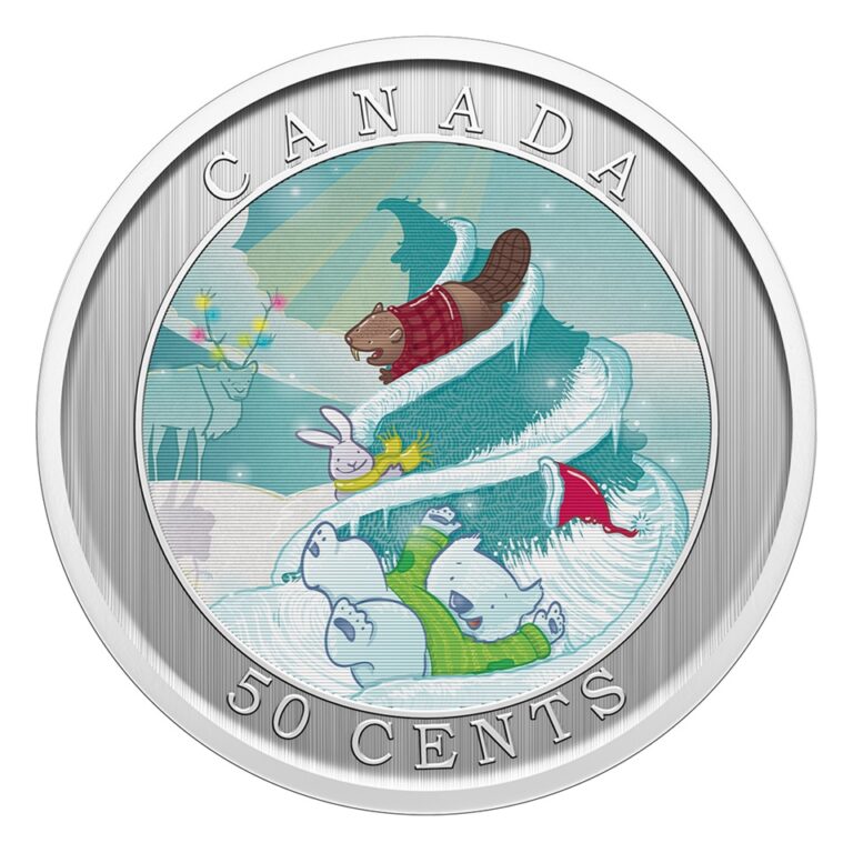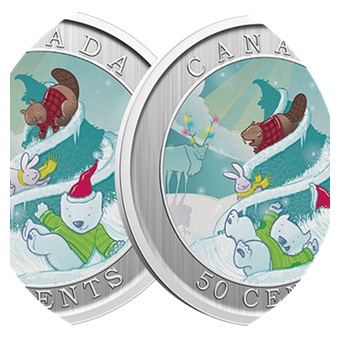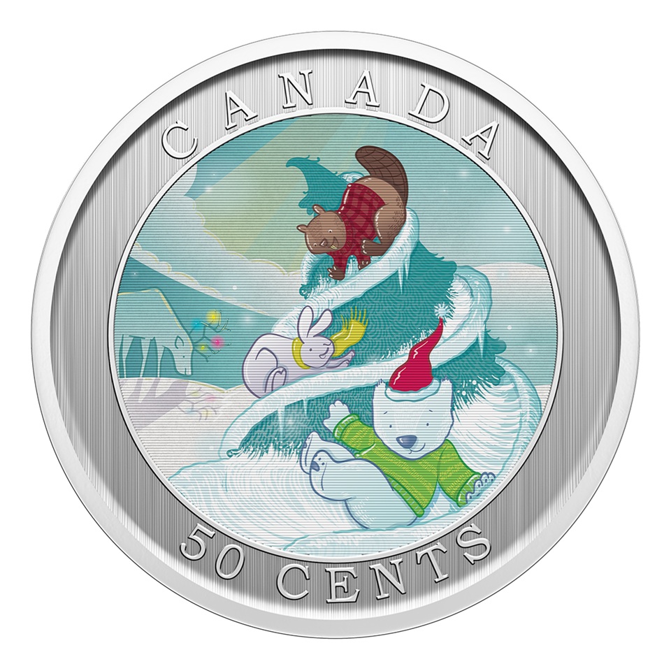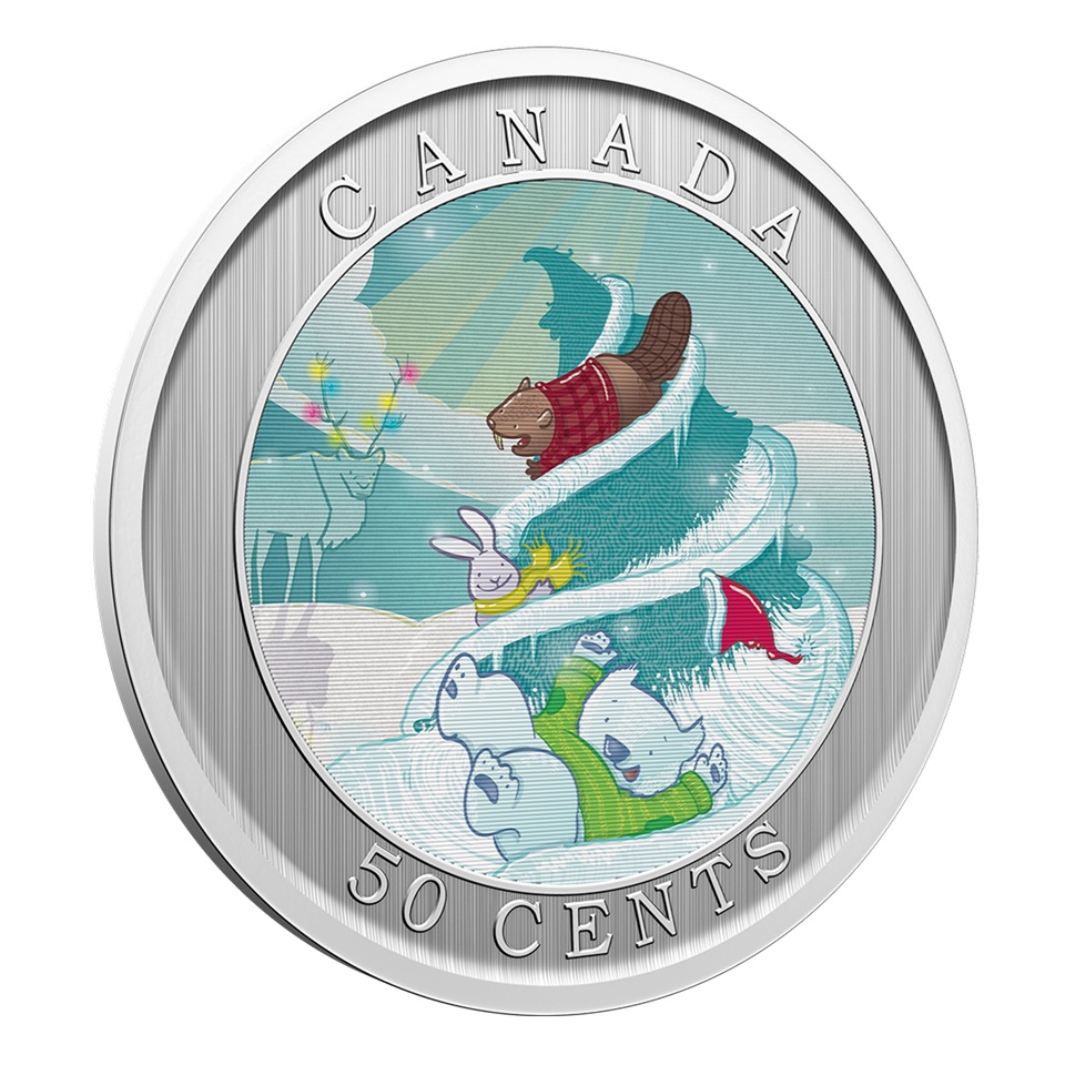 Au revers, dans un cercle, un dessin colorisé réalisé par l’artiste Emily Chen, représentant un sapin enneigé enchanté sur lequel l’ours polaire Churchill, habillé d’un pullover et d’un bonnet à pompon s’amuse à glisser avec deux amis, un lapin et un castor ; en arrière-plan, sur la gauche, un caribou aux bois enluminés ; entre le cercle et le listel, le nom du pays émetteur en haut, à savoir le Canada, et la valeur faciale « 50 CENTS » en bas.