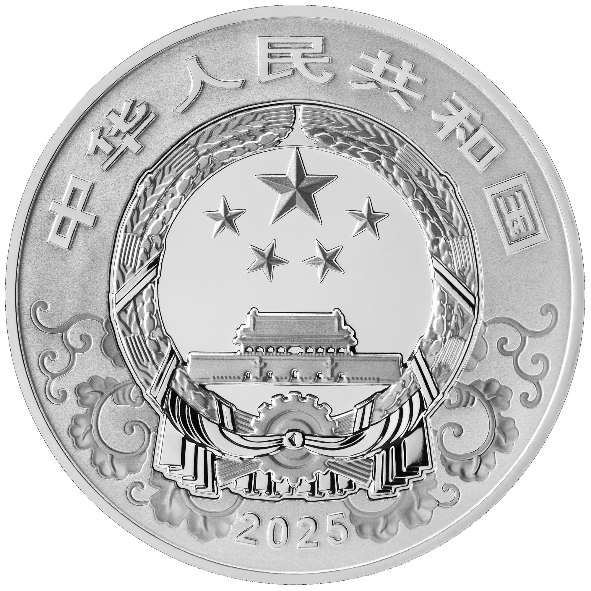 A l’avers, entre les kanji chinois désignant le pays émetteur dans la partie haute, à savoir la République populaire de Chine (« 中华人民共和国 », prononcé zhōnghuá rénmín gònghéguó), et le millésime 2025 dans la partie basse, encadré par des feuilles, les armoiries de ce pays, composées de la place Tian’anmen d’or surmontée de cinq étoiles à cinq branches de même, dans une couronne de blé et de riz avec à sa base une roue dentée de même, devant des rubans de gueules et sur fond de même.