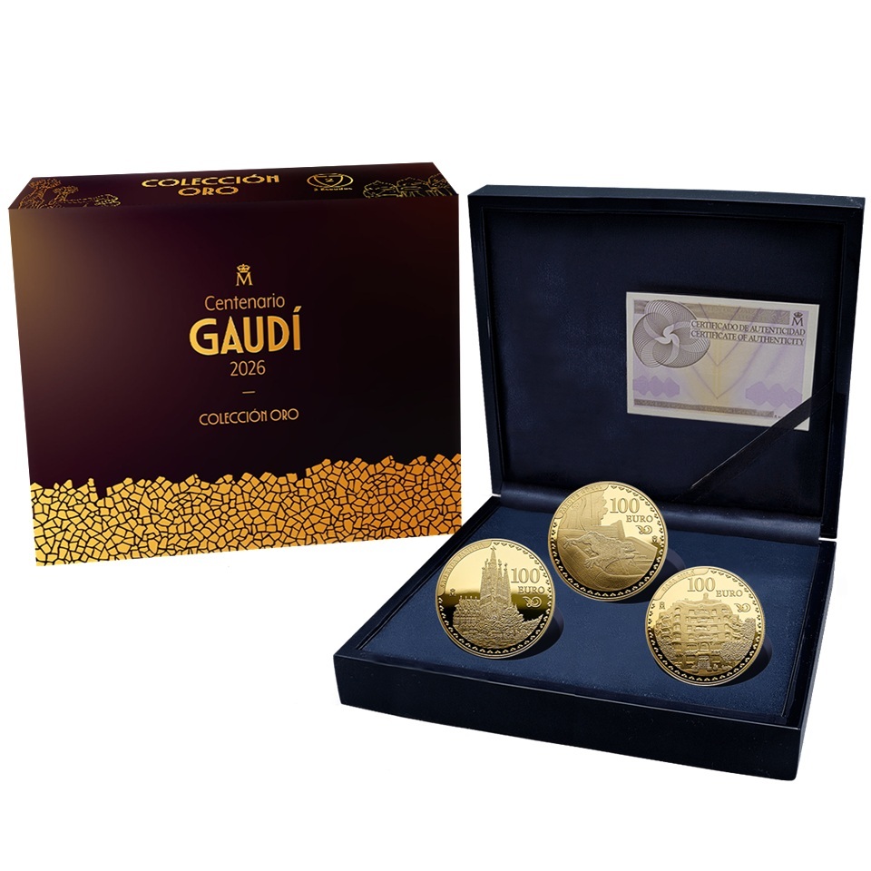 Coffret monétaire contenant 3 monnaies de collection chacune d’une valeur faciale de 100 Euro, en or, émises pour l’Espagne en 2026, dans la qualité BE (Belle Epreuve), par la Fabrique Nationale de Monnaies et Timbres d’Espagne (FNMT – Fábrica Nacional de Moneda y Timbre).