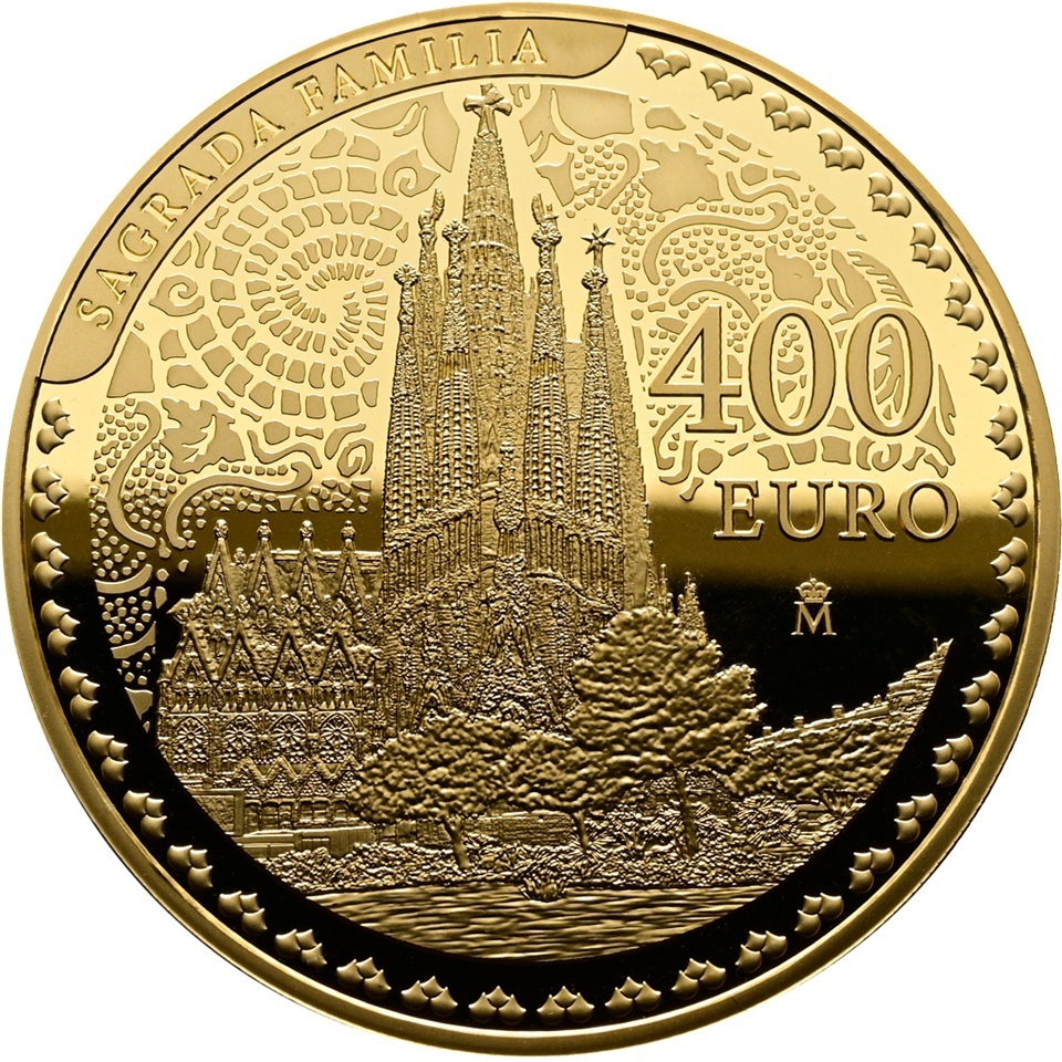 Au revers, un dessin célébrant le centième anniversaire de la mort de l’architecte Antoni Gaudí, avec une vue sur la Sagrada Família ; sur la gauche, la marque distinctive de la Fabrique Nationale de Monnaies et Timbres d’Espagne (FNMT – Fábrica Nacional de Moneda y Timbre (la lettre M majuscule couronnée)) ; sur la droite, la valeur faciale « 400 EURO » ; en haut à gauche, longeant le listel, la légende « SAGRADA FAMILIA ».