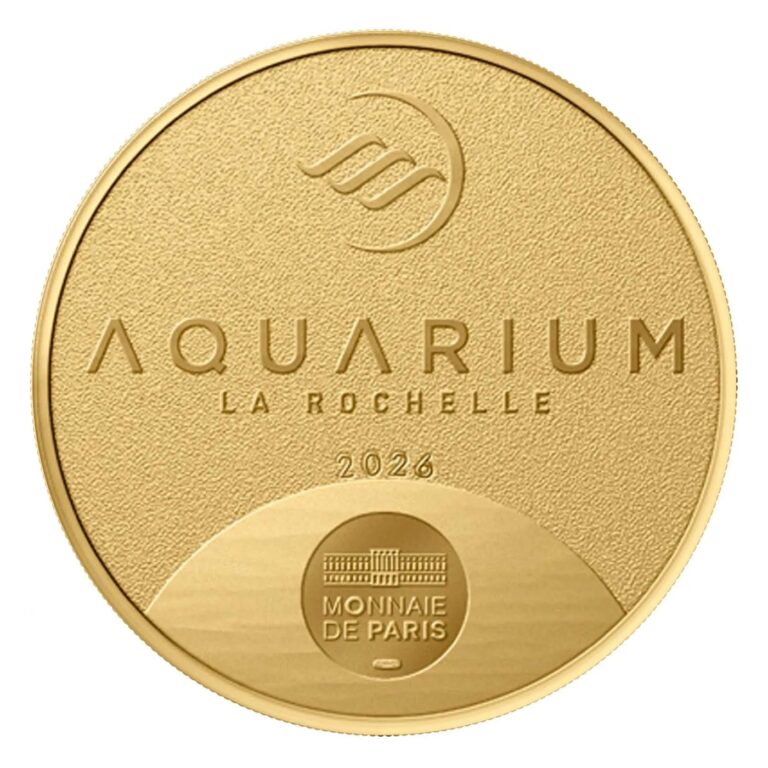 Au revers, les logos de l’aquarium de La Rochelle et de la Monnaie de Paris, et le millésime 2026 ; en exergue, le poinçon de l’institut monétaire français à la double corne d’abondance.