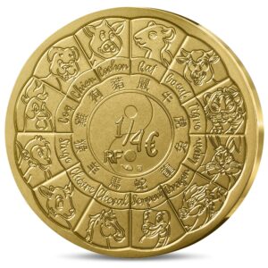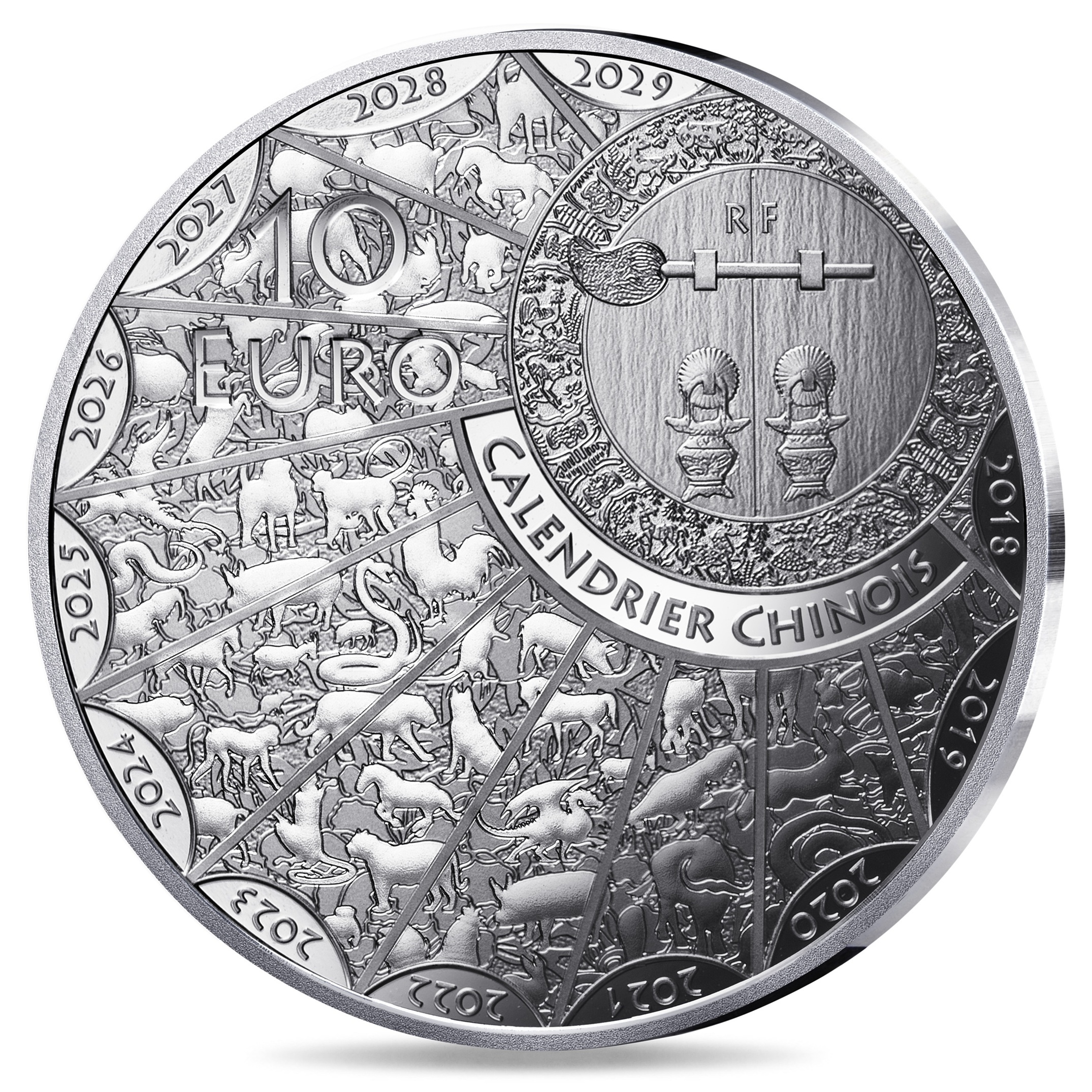Au revers, dans la partie supérieure droite, constituant le sommet d’un paravent orné des douze animaux du calendrier lunaire chinois, les portes d’un temple, chargées des initiales « RF » de République Française, entourées de motifs représentant lesdits animaux et surmontant la légende « CALENDRIER CHINOIS » ; autour, contre le listel, les années 2018, 2019, 2020, 2021, 2022, 2023, 2024, 2025, 2026, 2027, 2028 et 2029, correspondant aux millésimes des pièces qui entrent dans la série numismatique à laquelle celle-ci appartient ; en haut à gauche, la valeur faciale « 10 EURO ».
