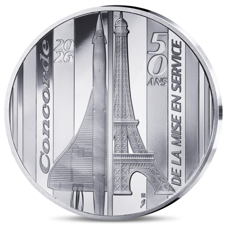 A l’avers, gravé par l’artiste graveur général Joaquin Jimenez, un dessin commémorant les cinquante ans du premier vol commercial du Concorde, avec une représentation de l’appareil à côté de la Tour Eiffel ; en haut à gauche, le millésime « 2026 » ; en bas à droite, sous la Dame de fer, la marque distinctive de la Monnaie de Paris (poinçon à la corne d’abondance) et le différent monétaire de Joaquin Jimenez ; légendes : « Concorde » et « 50 ANS DE LA MISE EN SERVICE ».