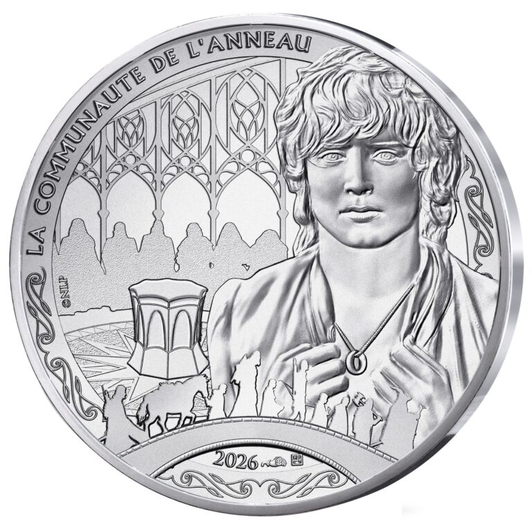 Cette pièce, dont l’avers représente la Communauté de l’anneau, entre dans une collection dédiée au Seigneur des Anneaux.
