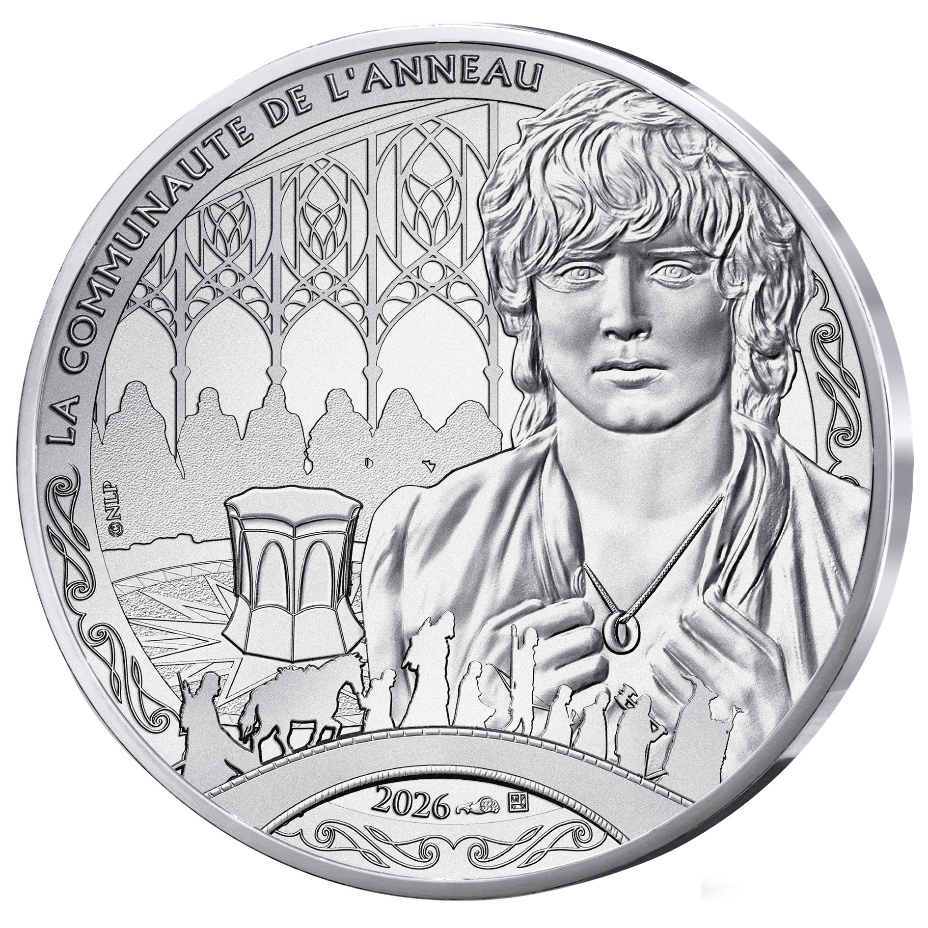 A l’avers, un dessin en l’honneur du film intitulé « Le Seigneur des anneaux : La Communauté de l’anneau », avec une représentation de Frodon Sacquet à Fondcombe, portant l’Anneau unique en pendentif, et, en bas, les silhouettes de nomades suivant le pèlerin Gandalf, en Terre du Milieu ; de gauche jusqu’en haut, longeant le listel, la légende « LA COMMUNAUTE DE L’ANNEAU » ; sur la gauche, l’inscription « © NLP » ; en bas, sous le pont, la marque distinctive de la Monnaie de Paris (poinçon à la corne d’abondance), le différent monétaire de Joaquin Jimenez et le millésime « 2026 ».