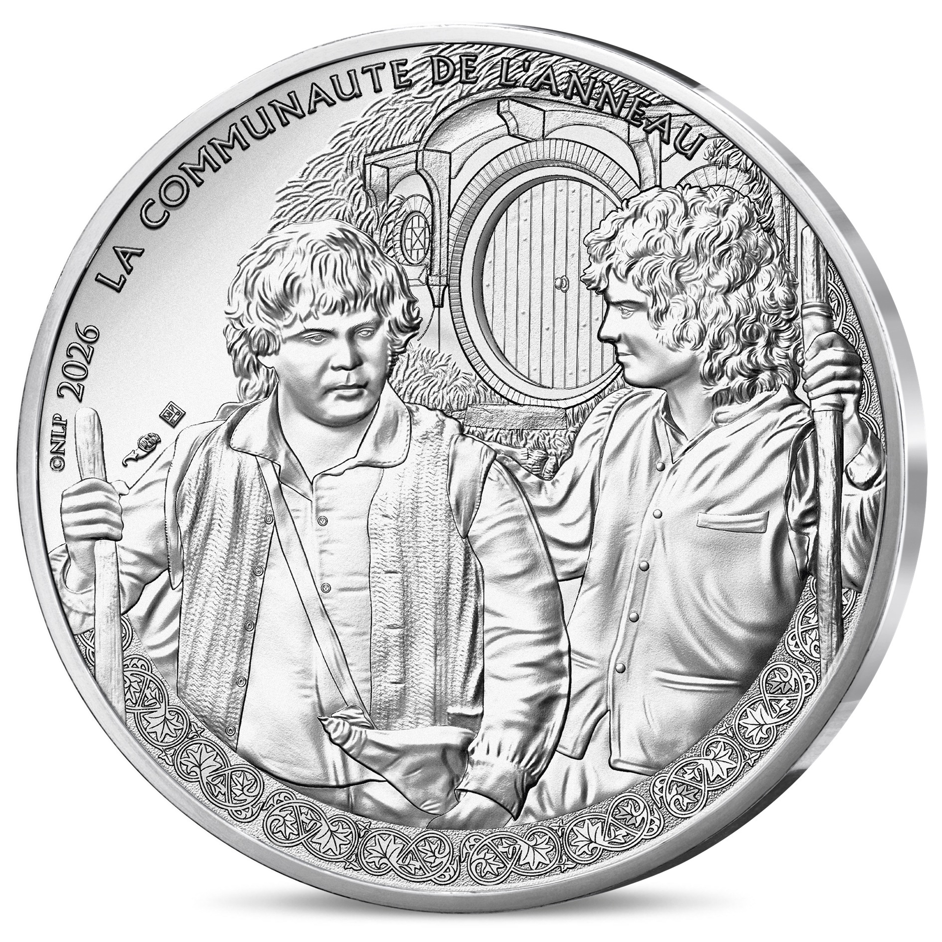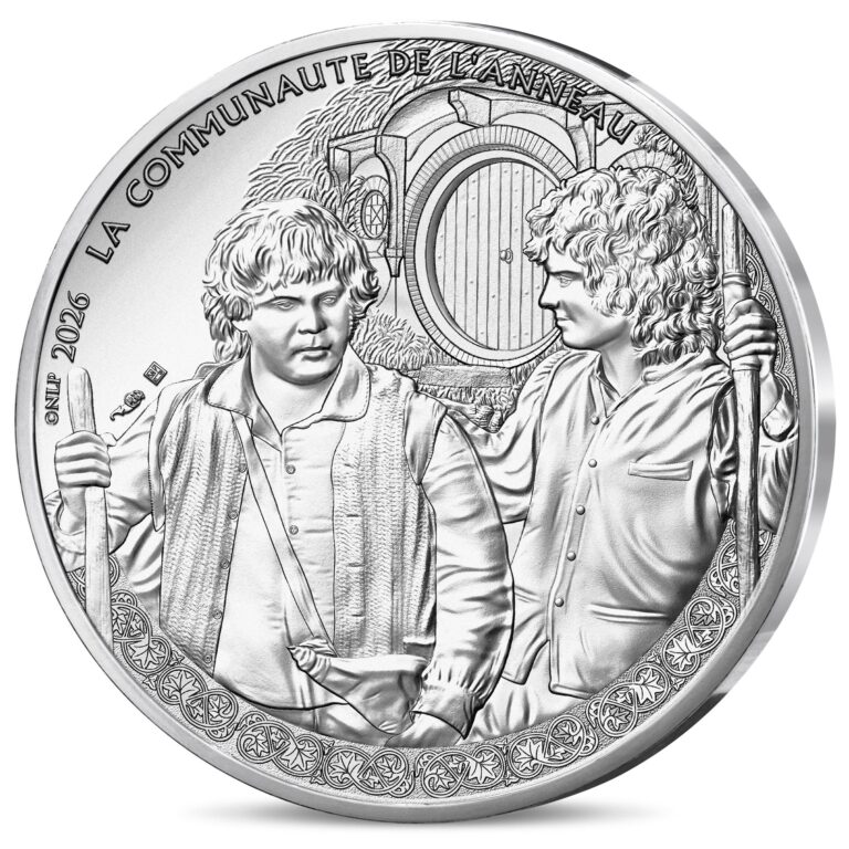 A l’avers, un dessin en l’honneur du film intitulé « Le Seigneur des anneaux : La Communauté de l’anneau », avec une représentation de Frodon Sacquet et de son compagnon de voyage Samsagace Gamegie au départ de la Comté, chacun muni d’un bâton de marche ; en arrière-plan, une maison de Hobbit ; en haut, longeant le listel, la légende « LA COMMUNAUTE DE L’ANNEAU » ; sur la gauche, la marque distinctive de la Monnaie de Paris (poinçon à la corne d’abondance) et le différent monétaire de Joaquin Jimenez, et, contre le listel, l’inscription « © NLP » suivie du millésime « 2026 ».