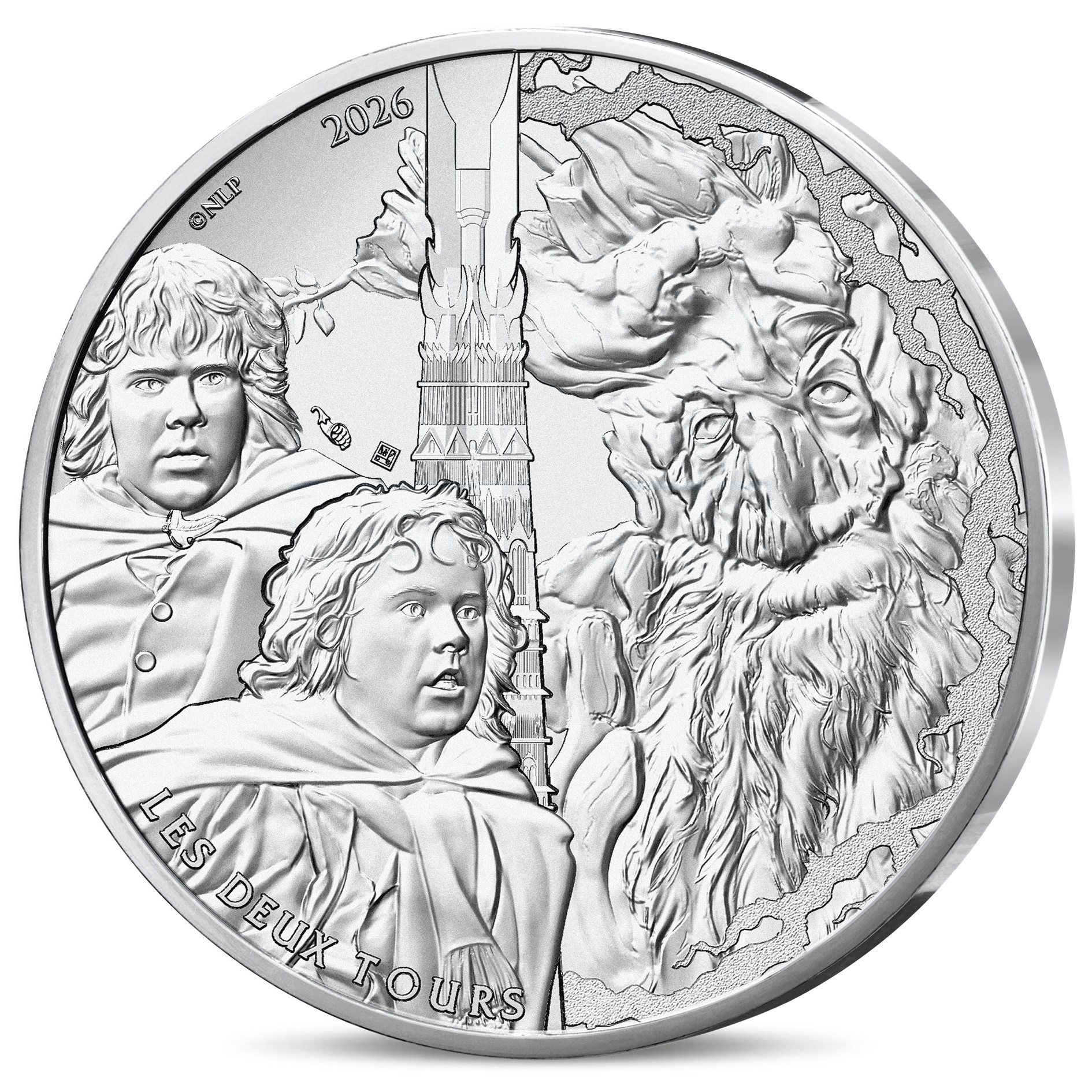 A l’avers, un dessin en l’honneur du film intitulé « Le Seigneur des anneaux : Les Deux Tours », avec une représentation de Merry, Pippin et Sylvebarbe dans la forêt de Fangorn ; en bas à gauche, longeant le listel, la légende « LES DEUX TOURS » ; en haut à gauche, contre le listel, l’inscription « © NLP » suivie du millésime « 2026 » ; à gauche de la Tour d’Orthanc, la marque distinctive de la Monnaie de Paris (poinçon à la corne d’abondance) et le différent monétaire de Joaquin Jimenez.