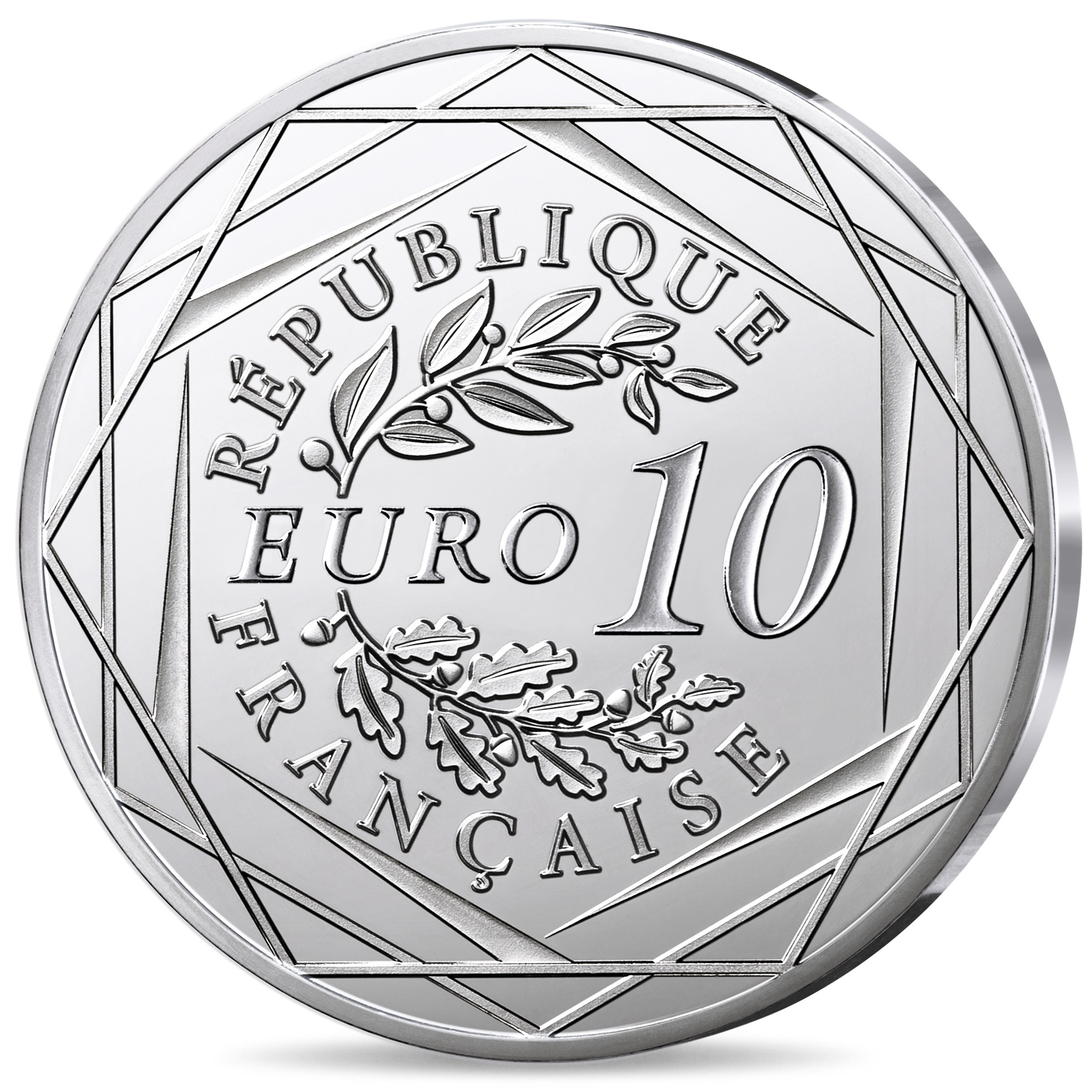 Au revers, dans deux hexagones entrecroisés, et dans une disposition formant le symbole de la devise Euro (€), la légende « RÉPUBLIQUE FRANÇAISE », la valeur faciale « 10 EURO », une branche de laurier et une de chêne.