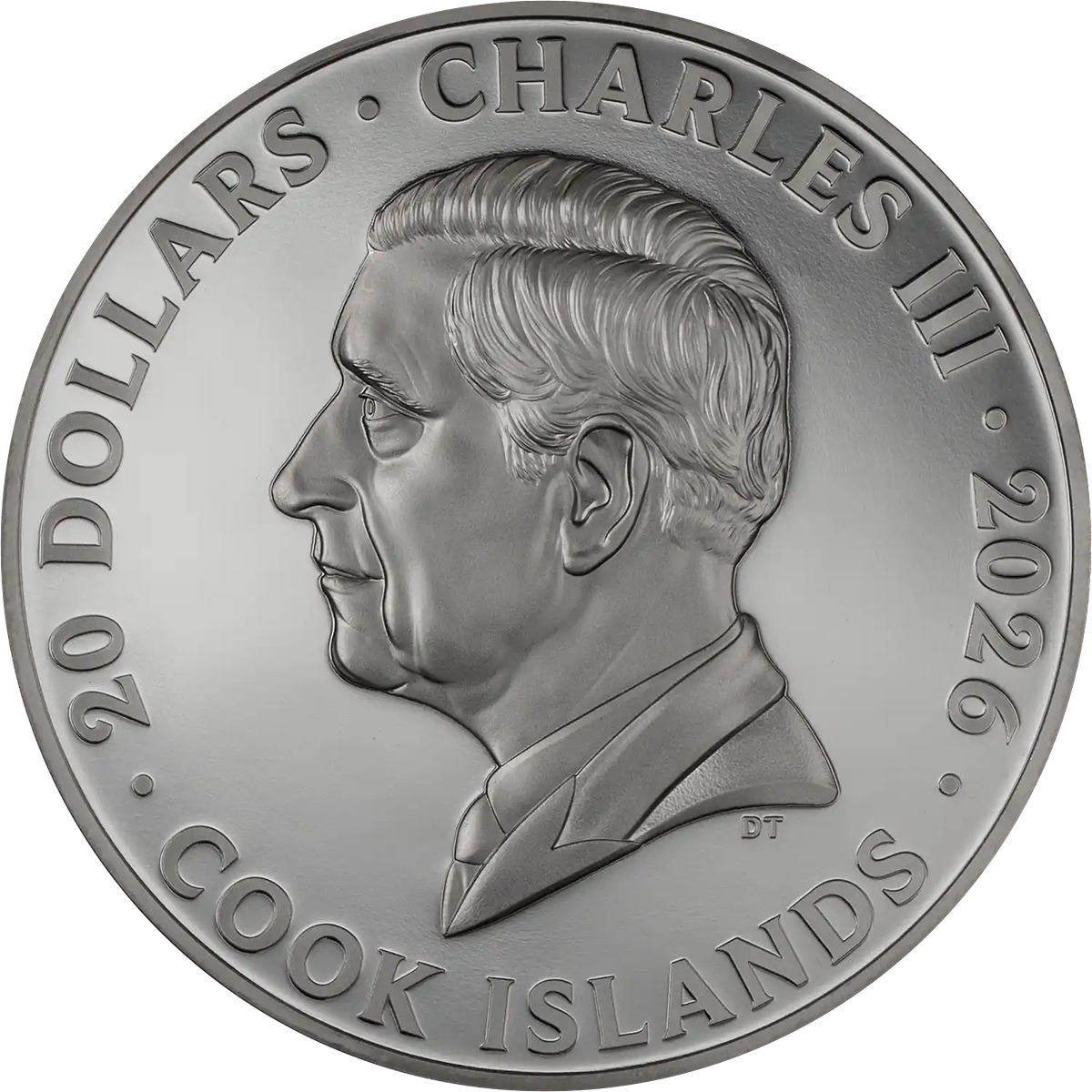 A l’avers, gravé par l’artiste Dan Thorne, dont les initiales « DT » apparaissent sous l’épaule gauche, le portrait de Sa Majesté le roi Charles III à gauche, portant un costume, une chemise et une cravate ; autour, le nom du souverain « CHARLES III », la valeur faciale « 20 DOLLARS », le millésime « 2026 » et le nom du pays émetteur, à savoir les Iles Cook (en anglais « COOK ISLANDS »).