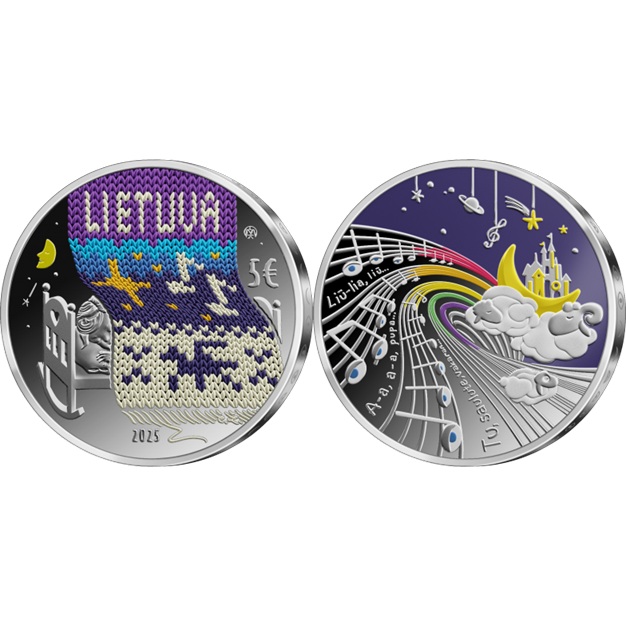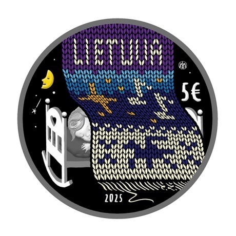 A l’avers, un dessin colorisé réalisé par l’artiste Eglė Žemaitė, représentant une pièce de broderie sur laquelle apparaissent l’emblème lituanien stylisé (le Vytis, qui est un chevalier en armure d’argent, sur sa monture de même, armé d’une épée d’argent à garde et poignée d’or et d’un bouclier d’azur chargé d’une double croix d’or) et le nom du pays émetteur, à savoir la Lituanie (en lituanien « LIETUVA »), utilisée pour couvrir un enfant endormi dans son lit et en train de rêver ; en haut à gauche, plusieurs astres, dont une lune personnifiée évoquant les soirées calmes et confortables durant lesquelles les contes sont narrés ; en haut à droite, la marque distinctive de la Monnaie de Lituanie (Lietuvos Monetų Kalykla) et la valeur faciale « 5 € » (5 EURO) ; en bas, le millésime « 2025 ».