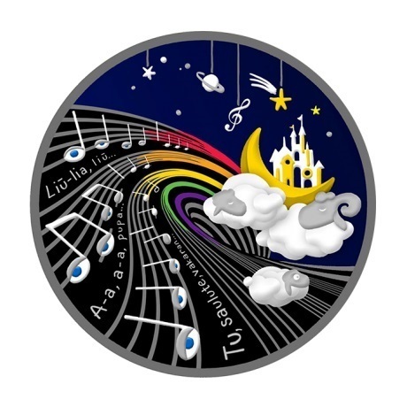 Au revers, un dessin colorisé réalisé par l’artiste Eglė Žemaitė, illustrant le monde onirique d’un enfant endormi après le chant d’une berceuse, avec des astres suspendus, des nuages en forme de moutons et des partitions menant à un palais des rêves, chargées de notes de musique aux croches remplacées par des yeux qui surmontent les inscriptions « Liū-lia, liū… » , « A-a, a-a, pupa… » et « Tu, saulute, vakuran… ».
