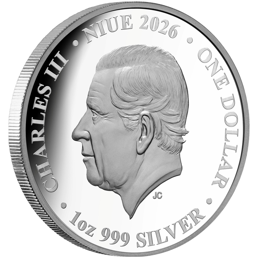 A l’avers, gravée par l’artiste Jody Clark, dont la signature JC apparaît sous le cou, la tête nue de Sa Majesté le roi Charles III à gauche ; autour, longeant le listel, le nom du souverain, celui du pays émetteur, à savoir Niue, le millésime « 2026 », la valeur faciale « ONE DOLLAR » (en français « UN DOLLAR ») et l’indication du poids et du titrage du métal, 1 oz (une once) et 999 SILVER (argent fin).