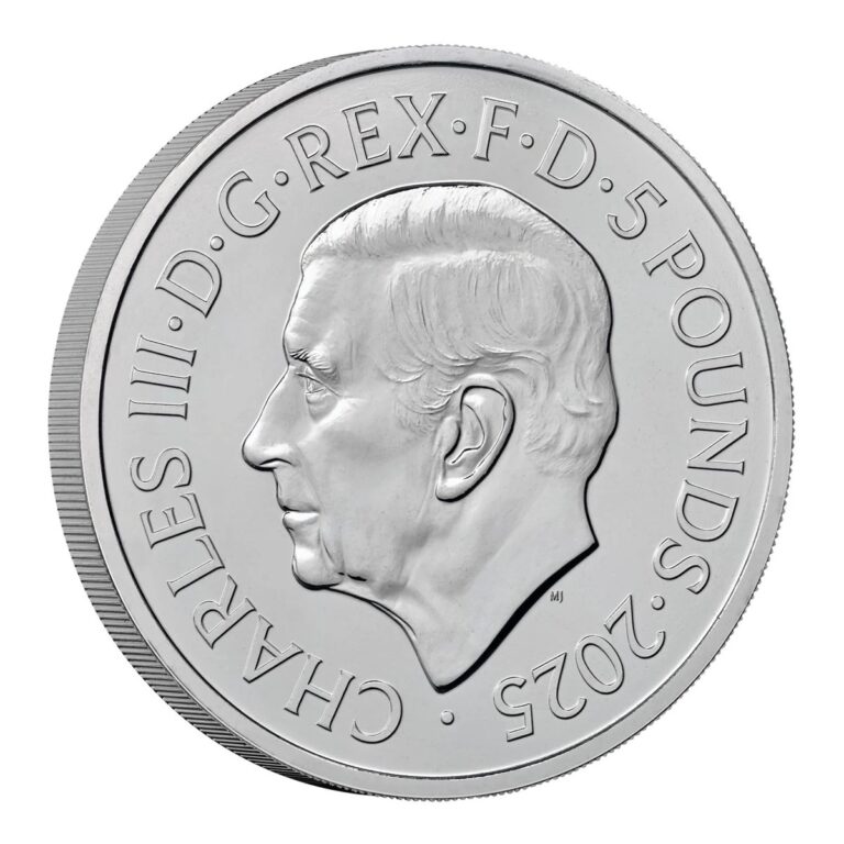 A l’avers, gravée par l’artiste Martin Jennings, dont les initiales MJ apparaissent sous le cou, la tête nue de Sa Majesté le roi Charles III à gauche, entourée par le nom du souverain « CHARLES III », l’inscription « • D • G • REX • F • D • » (abréviations latines de « DEI GRATIA REX FIDEI DEFENSOR », traduisible en français par « PAR LA GRÂCE DE DIEU ROI ET DÉFENSEUR DE LA FOI »), la valeur faciale « 5 POUNDS » et le millésime « 2025 ».