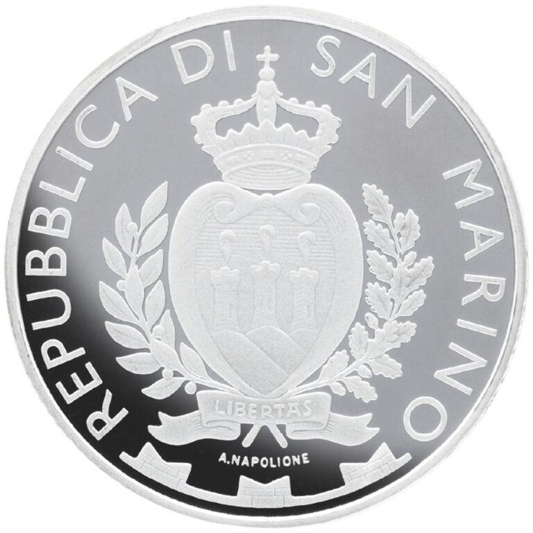 A l’avers, au centre, dessinées par l’artiste Antonella Napolione, dont la signature apparaît dans la partie basse, les armoiries de la République de Saint-Marin, aux trois tours Guaita, Cesta et Montale d’argent, chacune surmontée d’une plume d’argent, sur ciel d’azur, érigées sur les collines du Mont Titan de sinople, dans un cadre ovale d’or surmonté d’une couronne de même, entre une branche de laurier de sinople portant fruits d’or à gauche et une branche de chêne de sinople portant fruits d’or à droite, à la base couverte par une bannière d’argent portant l’inscription « LIBERTAS » de sable ; autour, longeant le listel, le nom du pays émetteur en italien « REPUBBLICA DI SAN MARINO ».