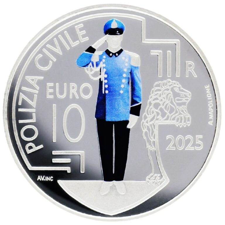 Dédiée à la police civile, cette pièce fait partie d’une série numismatique consacrée aux corps militaires saint-marinais.
