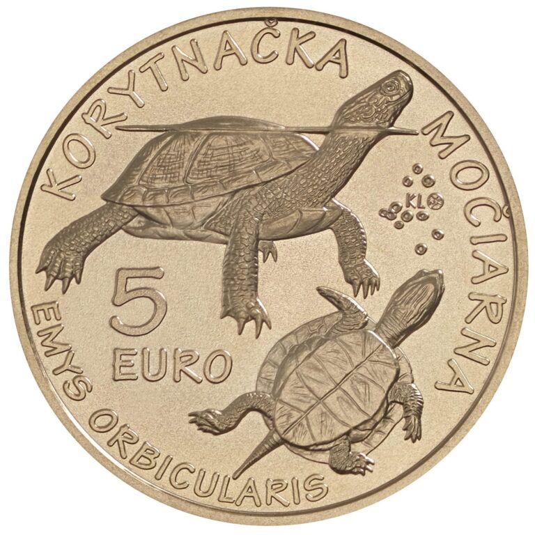 Dédiée à la cistude d’Europe (aussi connue sous le nom de tortue des marais, ou tortue bourbeuse), cette pièce fait partie d’une série numismatique consacrée à la faune et la flore en Slovaquie.