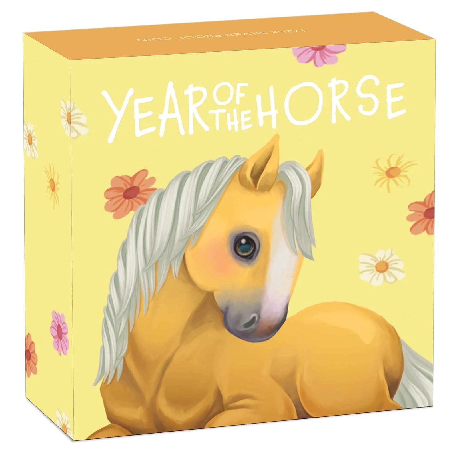 Au revers, un dessin colorisé réalisé par l’artiste Natasha Muhl, dont les initiales NM apparaissent en bas à gauche, sous l’équidé, célébrant l’Année lunaire du Cheval avec la représentation de l’animal bébé, posé sur une herbe fleurie ; dans la partie supérieure, la légende « YEAR OF THE HORSE » (en français « ANNÉE DU CHEVAL ») ; à gauche, une libellule ; à droite, le kanji chinois signifiant « Cheval » (馬, prononcé mǎ) et la marque distinctive de la Perth Mint (lettre P).